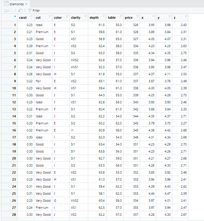 위 코드로 diamonds라는 data의 1행부터 시작해서 14줄의 데이터를 보여준다.